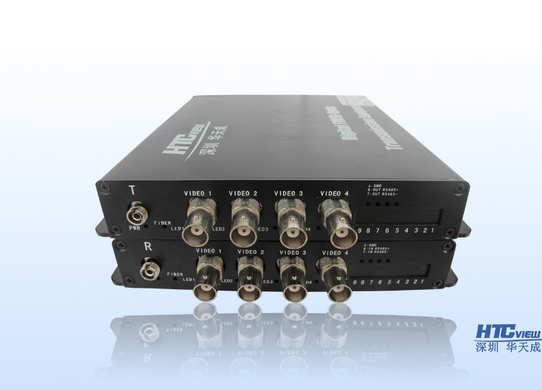 HTCVIEW 四路视频光端机采用国际最先进的数字及千兆光纤高速传输技术,将四路视频及多路RS-232/485/422数据、电话语音、以太网等信号在单芯或双芯光纤(单多模光纤)上无失真、高质量传输。
